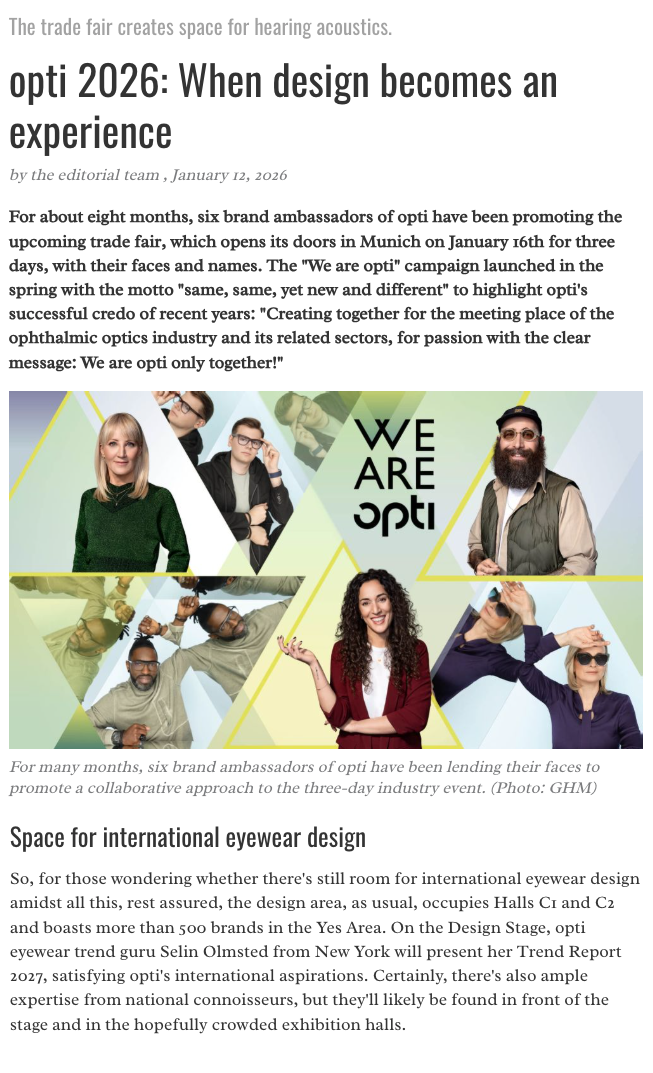 Selin Olmsted was featured at opti 2026, presenting her 2027 Eyewear Trend Report on the Design Stage as part of the fair’s international design program.