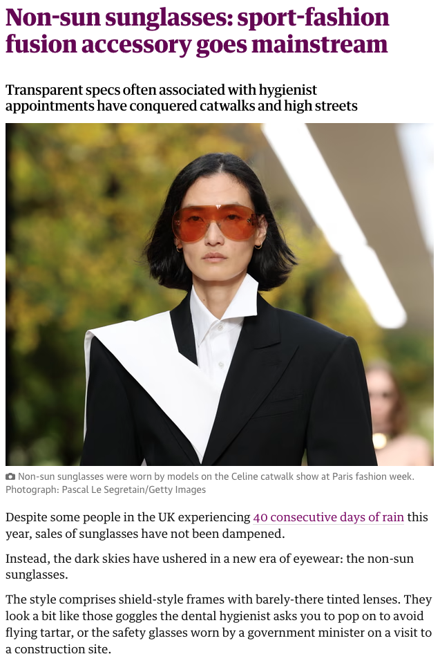 Selin Olmsted discusses the rise of “non-sun sunglasses” in a recent feature, highlighting shield-style frames with lightly tinted lenses designed for everyday wear, even on cloudy days.