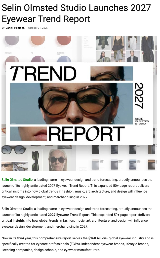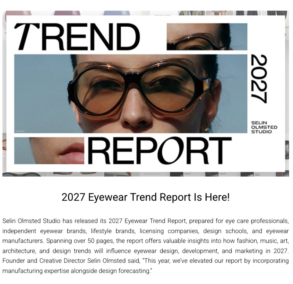 Selin Olmsted Studio has launched its 2027 Eyewear Trend Report, a 50+ page forecast exploring how global shifts in fashion, art, architecture, and culture will shape eyewear design and merchandising.
