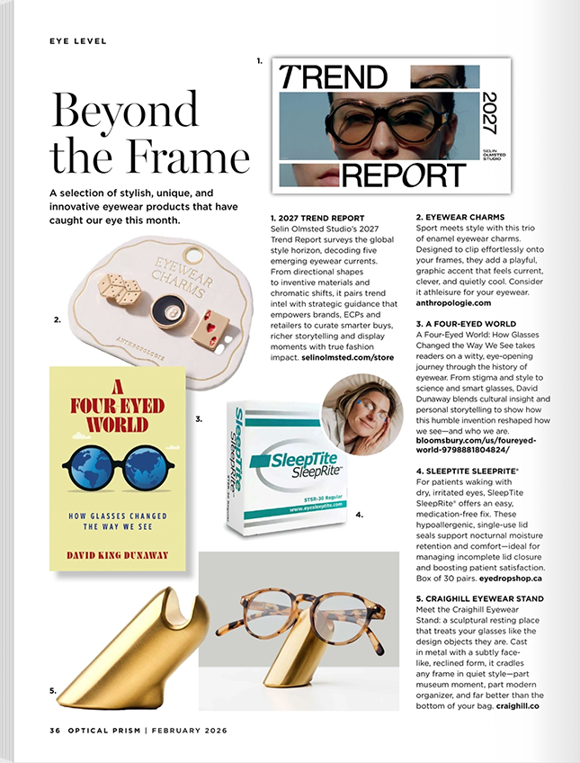 Selin Olmsted Studio's 2027 Trend Report decodes five emerging eyewear currents, from directional shapes and inventive materials to chromatic shifts, pairing trend intelligence with strategic guidance to help brands, ECPs, and retailers curate smarter buys and collections with true fashion impact.