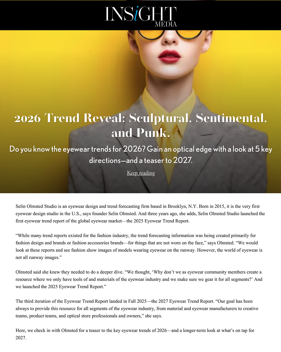 The article highlights her expertise in eyewear design and trend forecasting, drawing on insights from the Selin Olmsted Studio's annual Eyewear Trend Report.